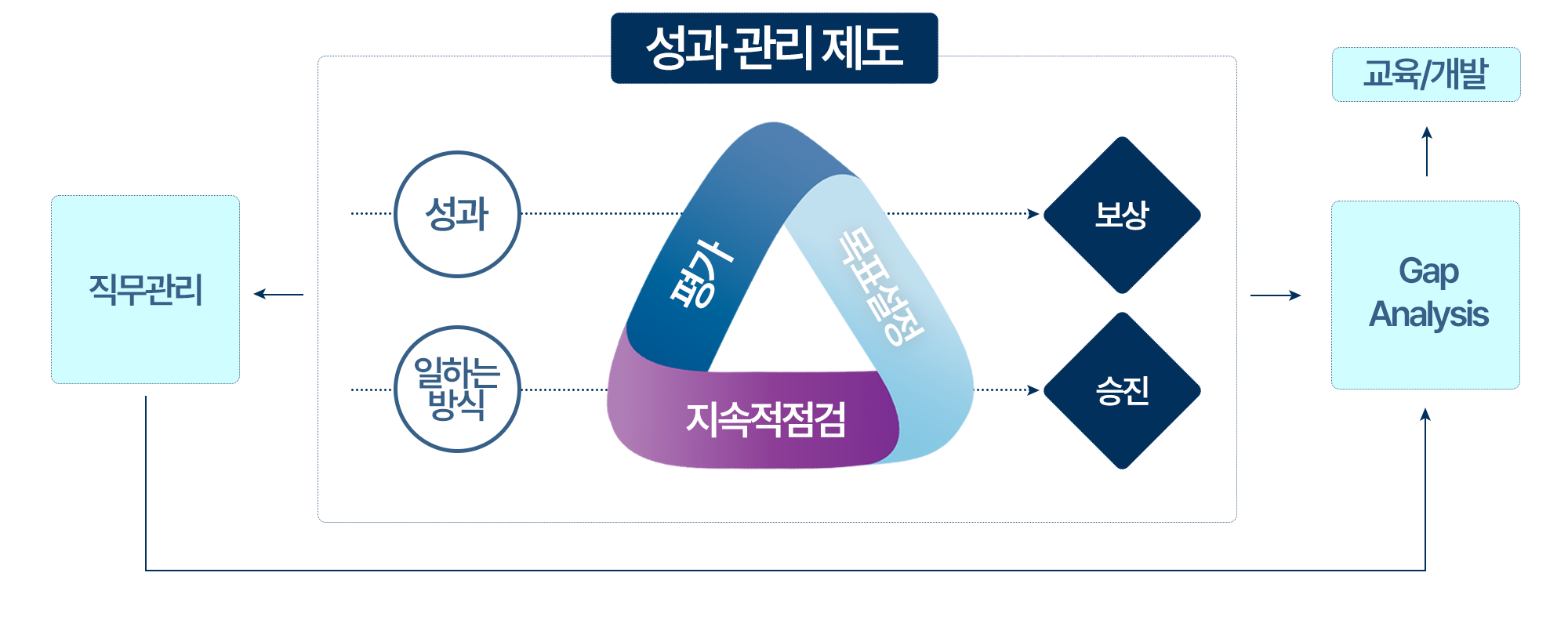 또한, 성과관리제도를 통해 개인과 조직의 성장을 정기적으로 점검하고 있습니다.