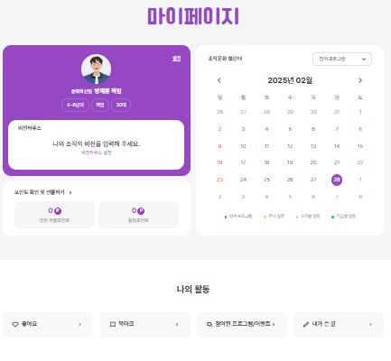 첫 로그인 시 설정한 관심분야를 변경할 수 있으며, 나의 활동내역을 확인할 수 있습니다. (좋아요, 북마크, 프로그램 참여 이력 등) 추천 콘텐츠를 확인 및 캘린더를 통해 조직문화 프로그램 일정 및 기타 일정들을 한눈에 확인 가능합니다. |