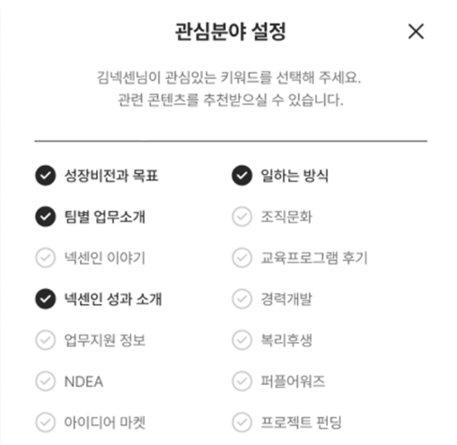 첫 로그인 시, 관심분야를 설정할 수 있습니다. 관심분야 설정 시, 메인화면에 관심분야의 콘텐츠가 노출이 되며 마이페이지에 추천 콘텐츠가 표시 됩니다.