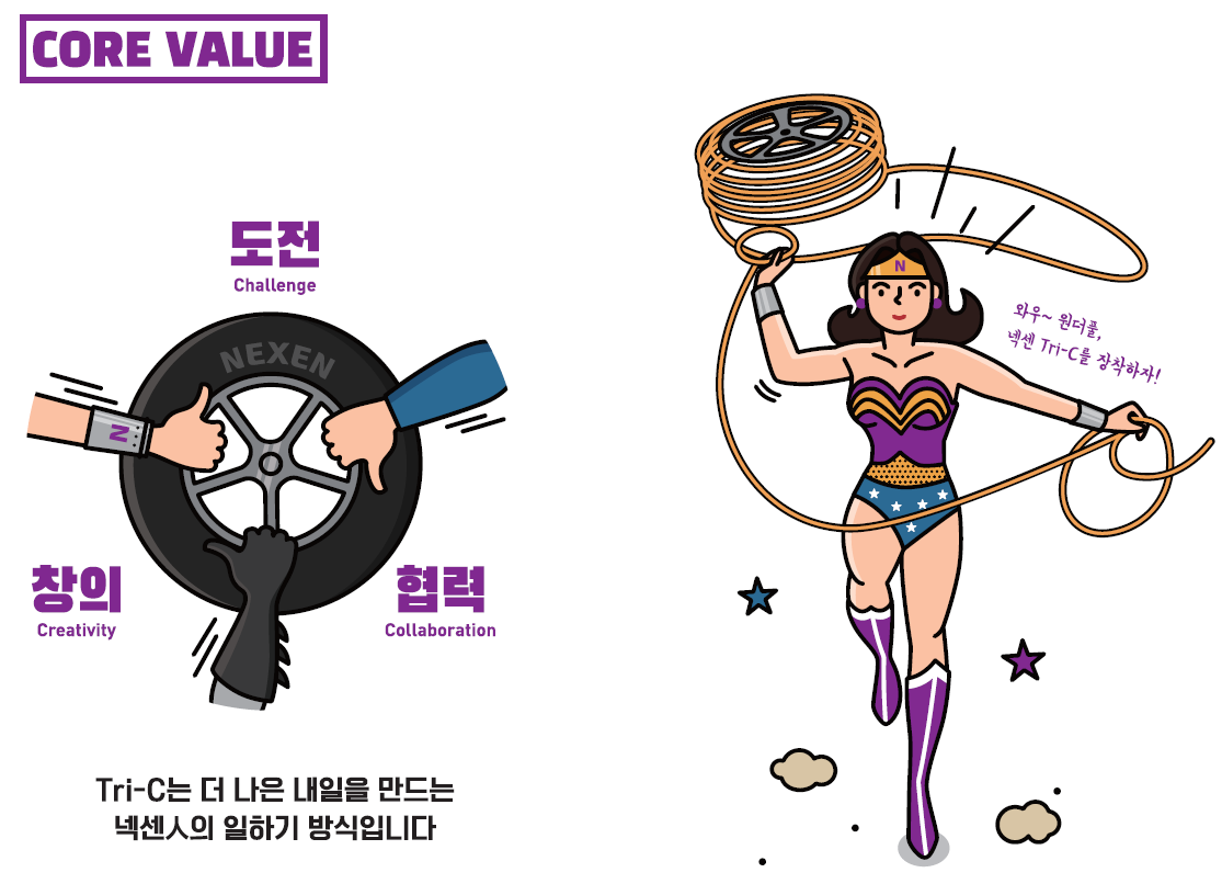 넥센타이어는 이와 함께 비전-북도 소개를 했는데요. 비전-북에는 우리가 알고 있는 익숙한 영웅(히어로)들이 나옵니다. 물론, 천부적 재능을 물려받은 것도 있겠지만 그들이 영웅이 되는 과정은 결코 쉽지 않습니다. 수없이 단련해야 하고, 수많은 도전 과제가 늘 있으며, 이를 극복해가면서 때로는 시행착오도 겪으며 조금씩 영웅의 면모가 드러나게 됩니다
