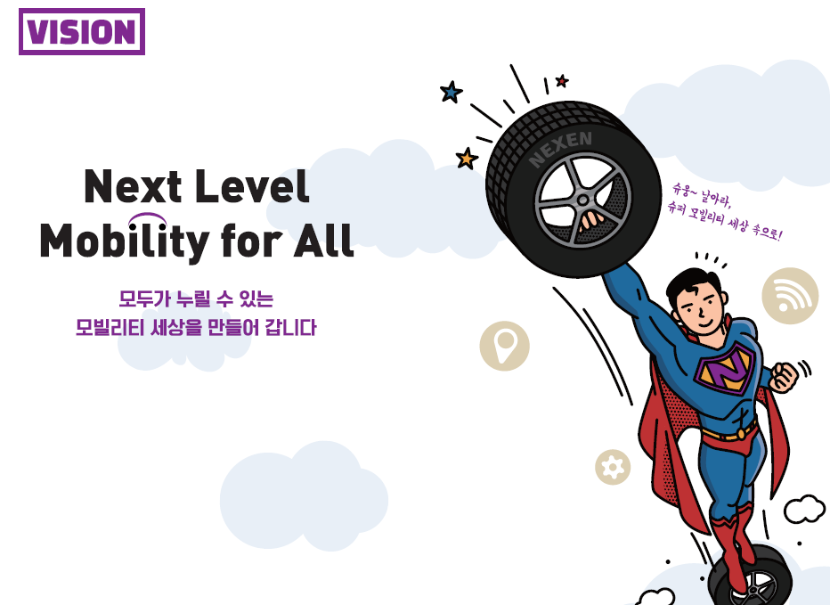 넥센타이어는 ‘Next Level Mobility for All’(모두가 누릴 수 있는 모빌리티 세상을 만들어 갑니다)을 비전으로 선포, 이는 사람을 먼저 생각하는 테크놀로지와 혁신적인 서비스를 기반으로 누구에게나 이동이 일상의 즐거움이 되는 세상을 만들겠다는 의지가 담겨 있었어요.