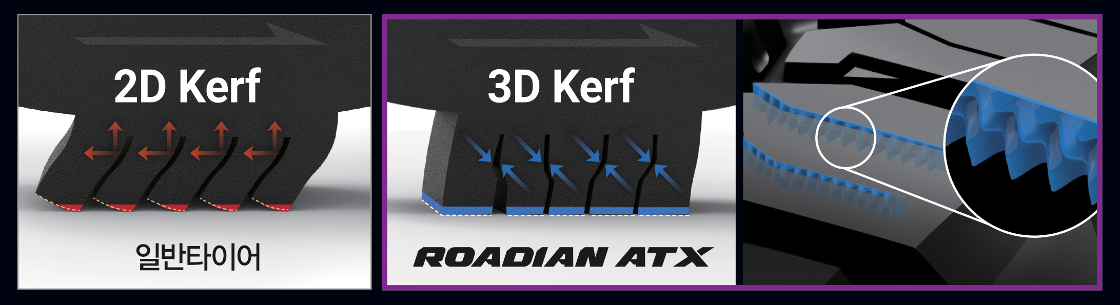 미세한 홈을 정교하게 설계한 '3D 커프' 기술을 통해 젖은 노면에서도 안정적인 접지력을 발휘하며, 핸들링과 제동력 성능이 강화되었어요.