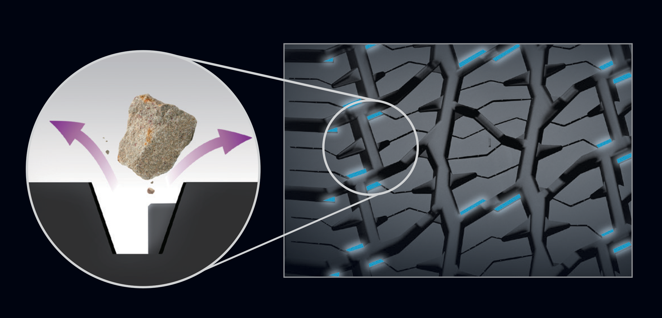 타이어 홈 사이에 낀 자갈을 주행 중 자연스럽게 배출하는 '스톤 이젝터'와, 바위나 자갈길에서도 접지력을 유지할 수 있도록 타이어 측면에 돌기 형태로 설계된 '사이드 바이트' 기술이 적용돼 험로에서도 안정감을 유지하도록 설계됐어요.