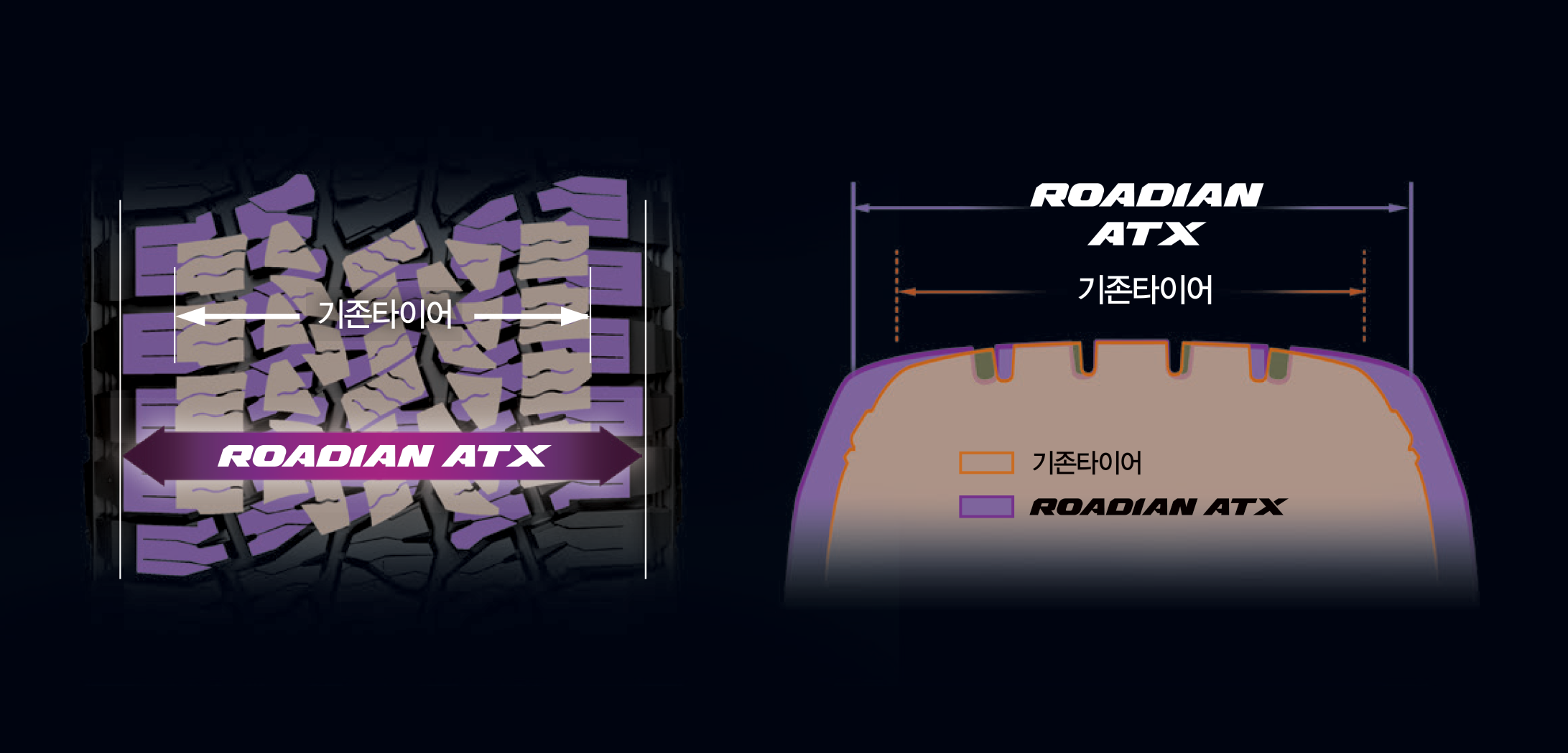 오프로드 주행을 대비한 사이드 바이트(Side Bite) 기술을 적용했으며, 듀얼 사이드월 디자인으로 기호에 따라 선호하는 디자인으로 적용할 수 있어요.