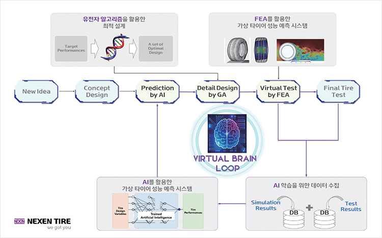 넥센타이어는 이 AI 기술을 활용한 타이어 성능 예측 시스템을 개발해 타이어 개발 절차 중 컨셉 설계 단계에서 머신 러닝 기술을 활용해 타이어 개발 시 고려되는 연비·소음·핸들링·접지·강성 등 주요 성능을 정확하고 빠르게 예측하게 된다고 해요.