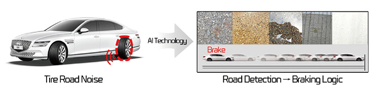 이 기술을 위해서는 먼저 콘크리트, 신규 아스팔트, 노후된 아스팔트의 마른 노면 및 젖은 노면 등 다양한 노면 외부 소음을 AI 빅데이터 기술로 수집 및 축적했어요. 그리고 여기에 이 방대한 데이터 결과값을 이용해 노면을 감지하고 타이어 제동 특성에 연결시키는 기술을 개발해 국내 최초 특허 출원 완료했어요.