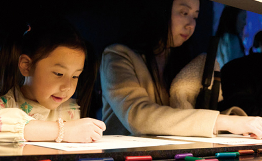 16개의 다양한 테마 속에서 특히 임직원 가족들의 발걸음을 멈추게 한 곳이 있었는데요. 바로 아이들이 직접 그린 그림을 실시간 3D 모션 캐릭터로 만들어 대형 스크린에서 만날 수 있는 체험 테마입니다. 크레파스와 종이가 놓인 커다란 테이블에 임직원 자녀들은 삼삼오오 모여들었습니다. 조그마한 손으로 자신만의 캐릭터를 채색하고, 잠시 후 화면에 짠하고 나타난 그 그림을 보며 온전히 전시에 몰입하는 즐거운 시간을 가졌습니다.