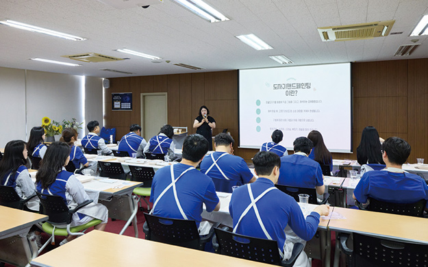 잠시 업무를 내려놓고, 직원들에게 기분 좋은 활력을 불어넣을 충전의 시간이 시작되었습니다. 각자의 자리 위에 가지런히 놓인 초벌 도자기와 붓, 물감 등의 재료를 본 직원들의 얼굴에는 설렘과 기대가 슬며시 물들었습니다. 특히 평소 다양한 원데이 클래스에 관심이 많았던 남자 직원들의 높은 참여도가 돋보이며, 클래스 시작 전부터 현장은 뜨거운 열기로 채워졌습니다.