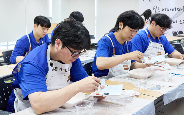 이제 텅 빈 도자기에 각자의 색과 생기를 채울 차례. 저마다 머릿속에 그려온 그림이 확실한 듯 누구 하나 망설이는 이가 없었는데요. 누군가는 반려견의 얼굴과 이름을 새기고, 누군가는 딸의 이름과 함께 말로 표현할 수 없는 큰 사랑을 담았습니다. 작업에만 오롯이 집중함으로 생긴 고요함은 마음까지 차분하게 만들었고, 직원들은 "순식간에 시간이 흘러갔다"며 만족감을 전했습니다.