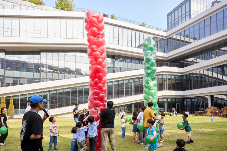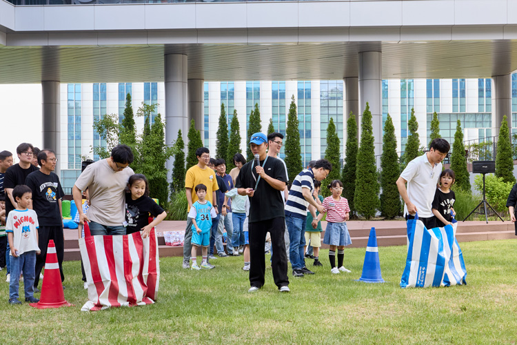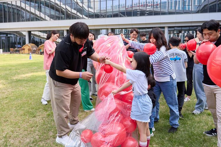 선선한 가을은 캠핑 가기 딱 좋은 계절이죠. 더 넥센유니버시티에는 멋진 중정이 있어요. 회사 안에 텐트를 칠 수 있을 만큼 드넓은 정원이 있다니 신기하죠~? 도심 풍경과 푸릇한 정원을 함께 누릴 수 있어 여느 캠핑장과는 색다른 풍경인데요. 우리 회사에 처음 온 가족들을 위해 ‘CITY TOUR’와 ‘OFFICE TOUR’ 시간을 준비했어요! 사옥 곳곳을 둘러보고, 팀원들에게 가족을 소개하는 시간을 가졌습니다. 투어를 마친 후에는 잔디 위에서 공놀이를 하고, ‘OO이네 집’과 같은 귀여 운 팻말로 텐트를 꾸미기도 했답니다.