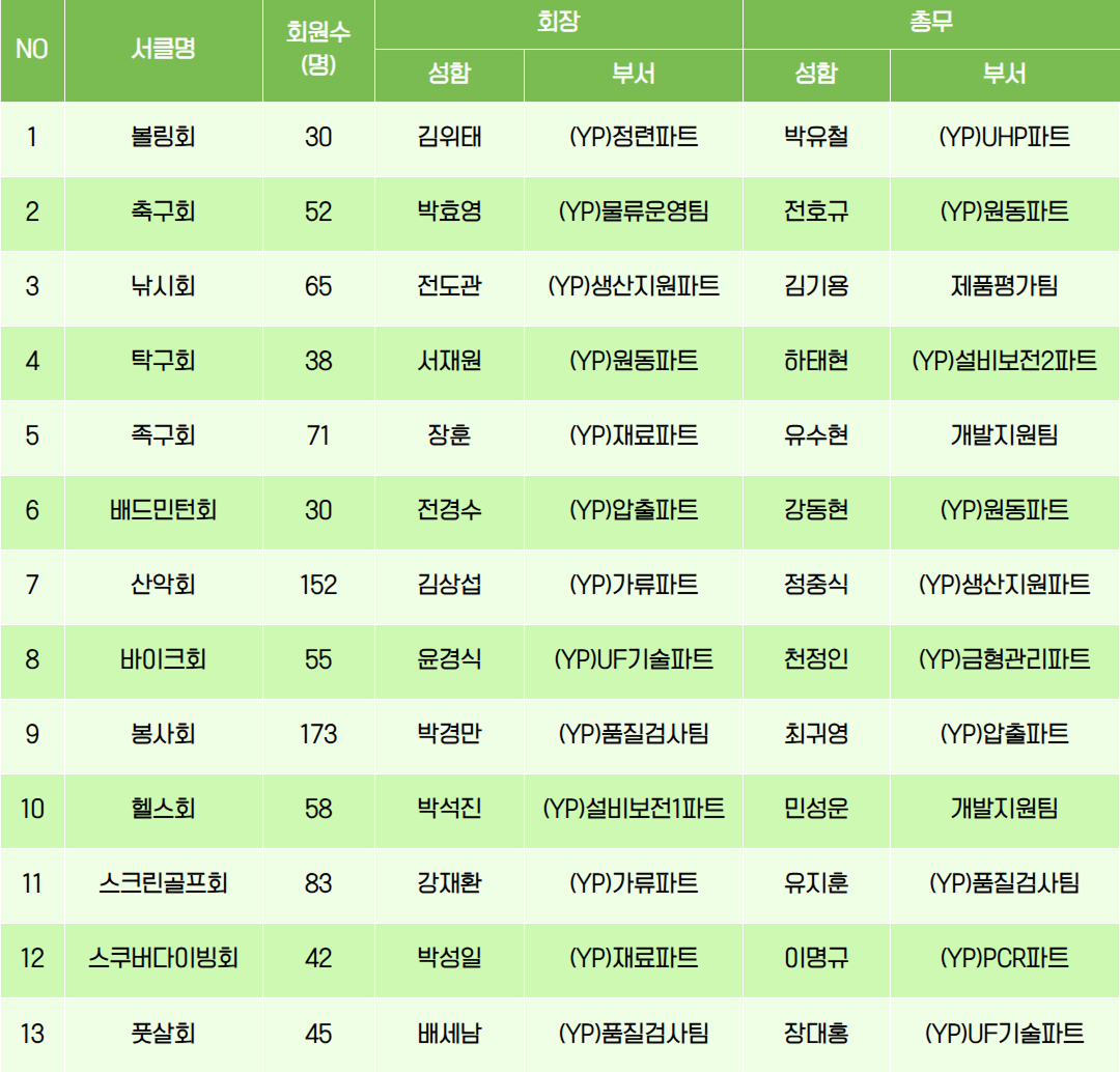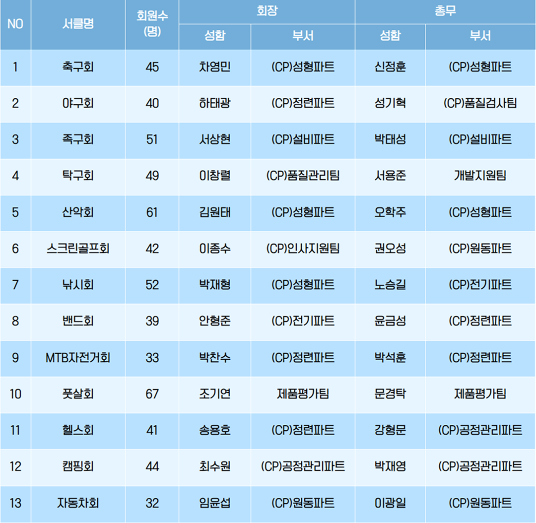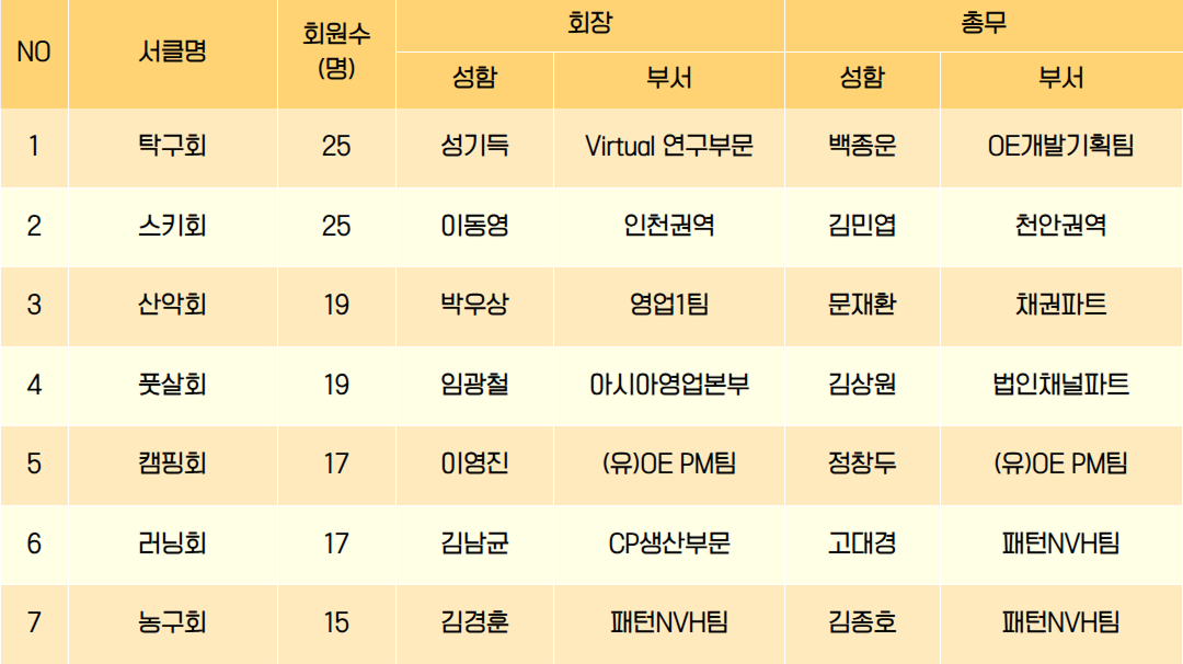 단, 최소 30인 이상(마곡, 영업 15명 이상)으로 구성하고, 가능한 5개 부서 이상의 사원들이 참가한 서클로 구성해야 하는데요. 1년 이상의 서클활동과 회비공제(1년 이상)를 하시면 개설 가능합니다.