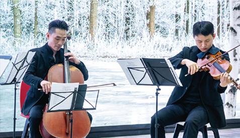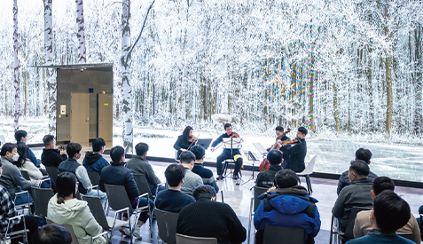 첼리스트 박장근을 비롯한 바이올리니스트 배시온, 김도윤과 비올리스트 맹진영으로 이루어진 현악 사중주단과 소프라노 최우영이 아티스트로 초청돼 한 시간 동안 황홀한 선율을 선사했어요. 18세기 유럽 귀족들이 기분 전환을 위해 연주했던 ‘디베르 디멘토’로 가볍게 포문을 연 현악 사중주단은 한국인이 사랑하는 클래식 ‘캐논’ ‘사계 중 겨울’을 비롯해 대중가요, 동요 ‘섬집아기’, 크리스마스 캐럴 ‘징글벨’ 등 다양한 장르의 곡들을 선보이며 듣는 즐거움을 더했는데요. 소프라노 최우영은 오페라 〈파우스트〉의 ‘보석의 노래’로 좌중을 압도하며 등장, 이탈리아 오페라 ‘오 나의 사랑하는 아버지’와 우리나라 가곡 ‘아름다운 나라’를 열창했습니다!